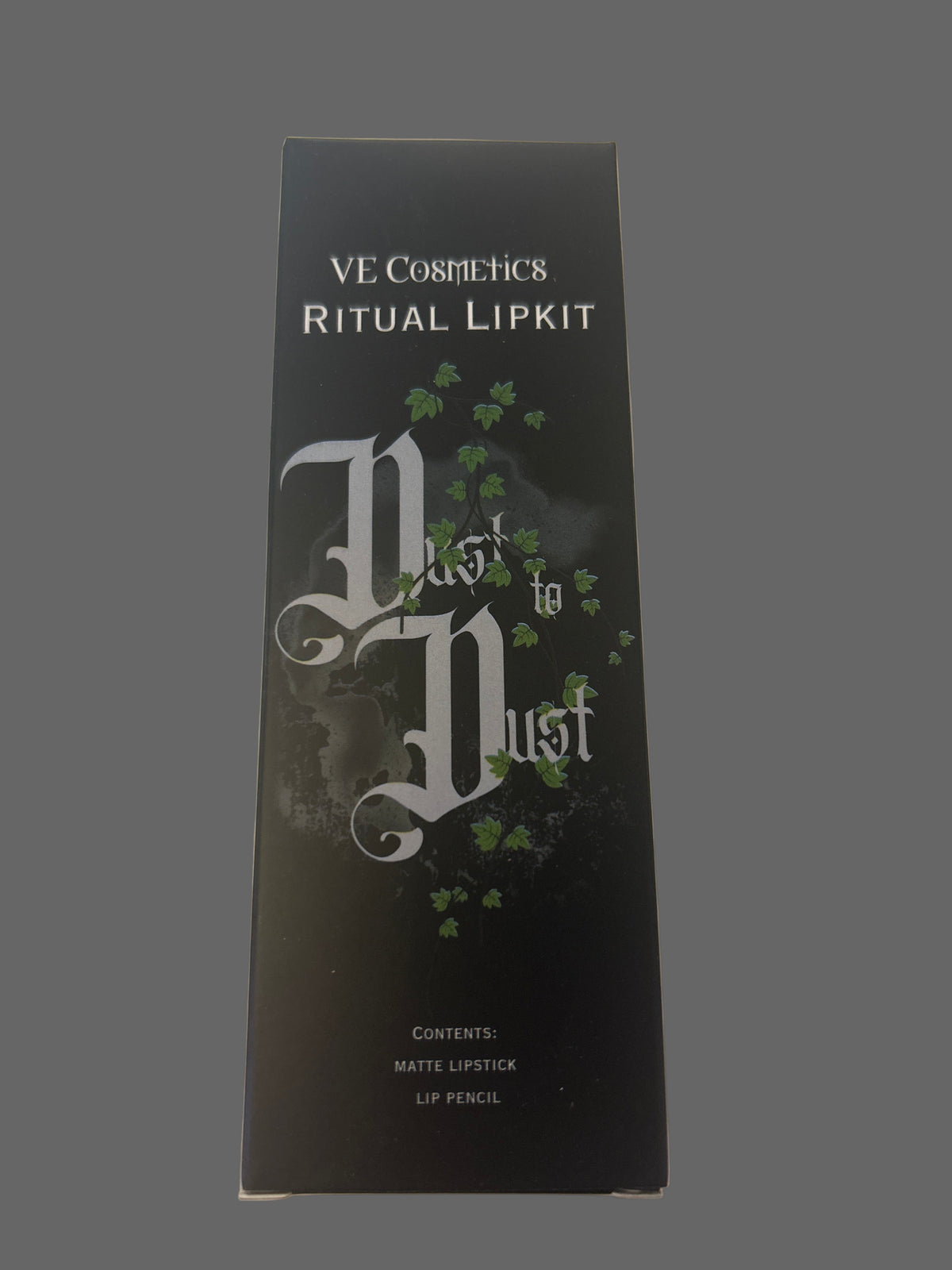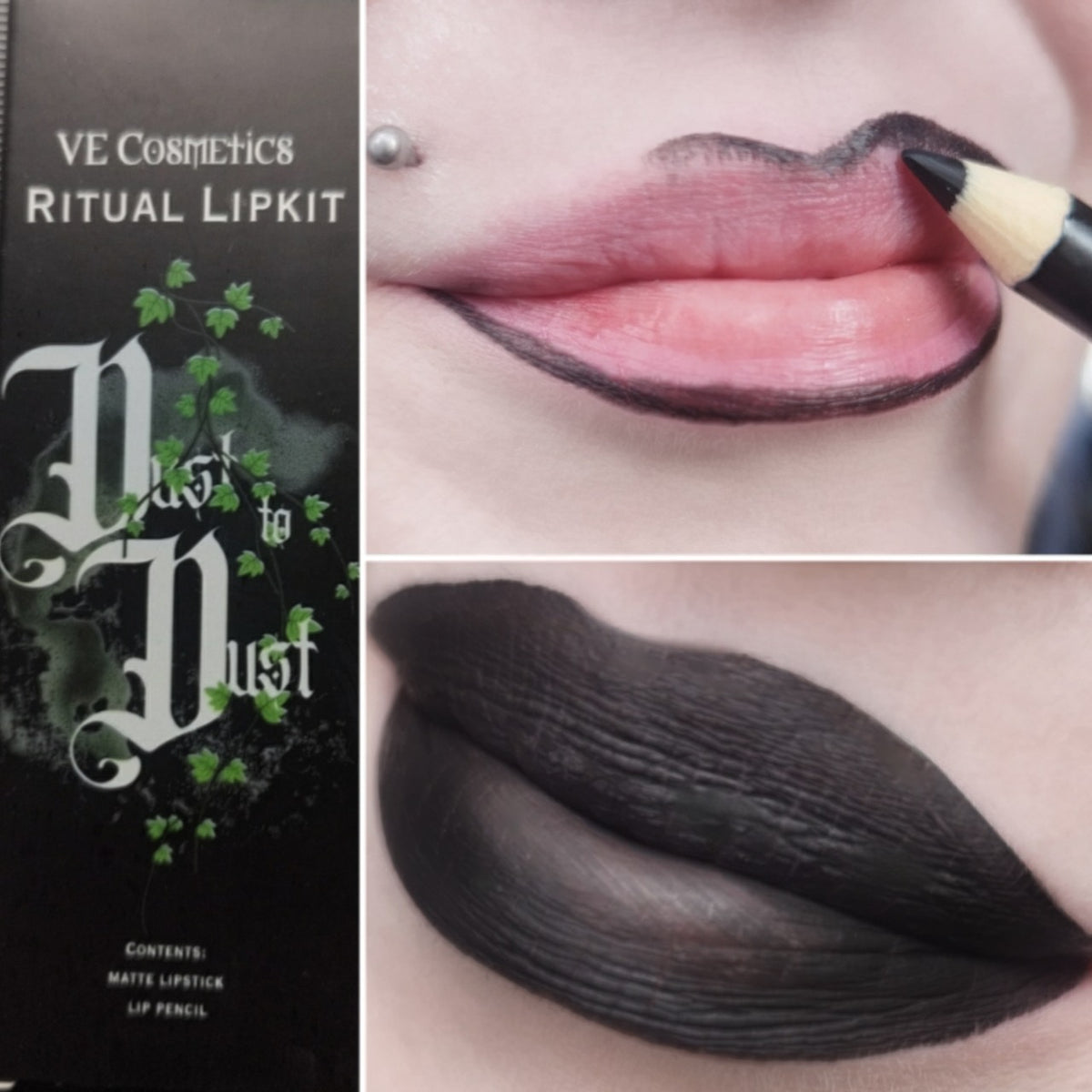 The Dust to Dust Lip Kit is a hauntingly bold duo featuring a deep matte black liquid lipstick and a precision-crafted black lip pencil — conjured to define and dominate.