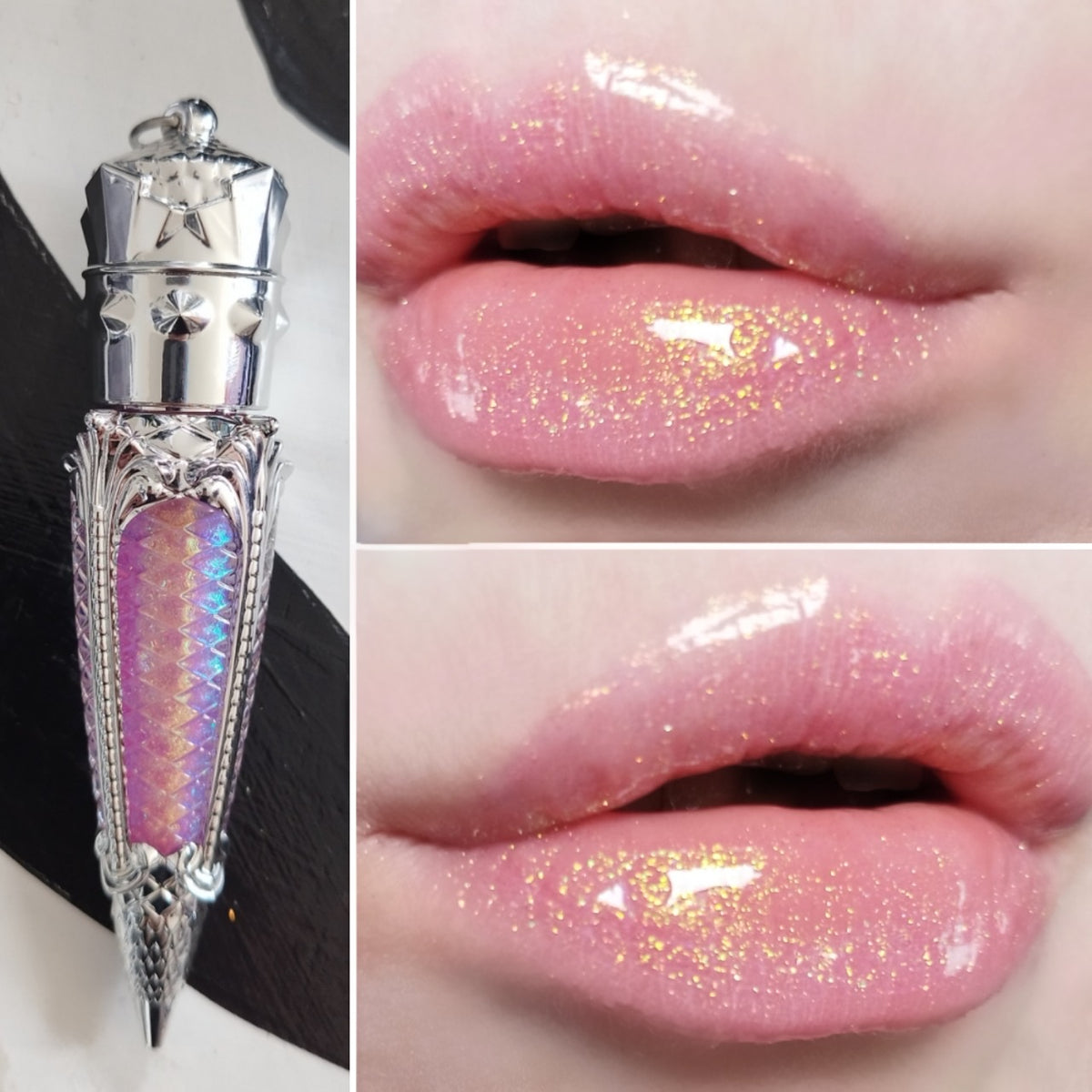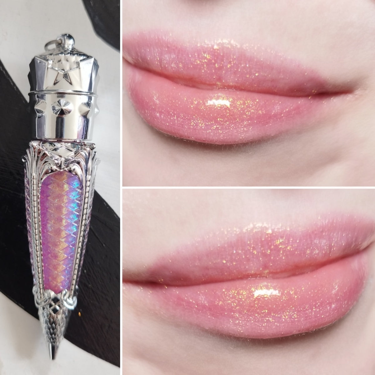Worn alone, it offers a gentle shimmer kissed with colour. Layered over black lipstick, it reveals hidden depths — a golden-pink radiance with a haunting twist.