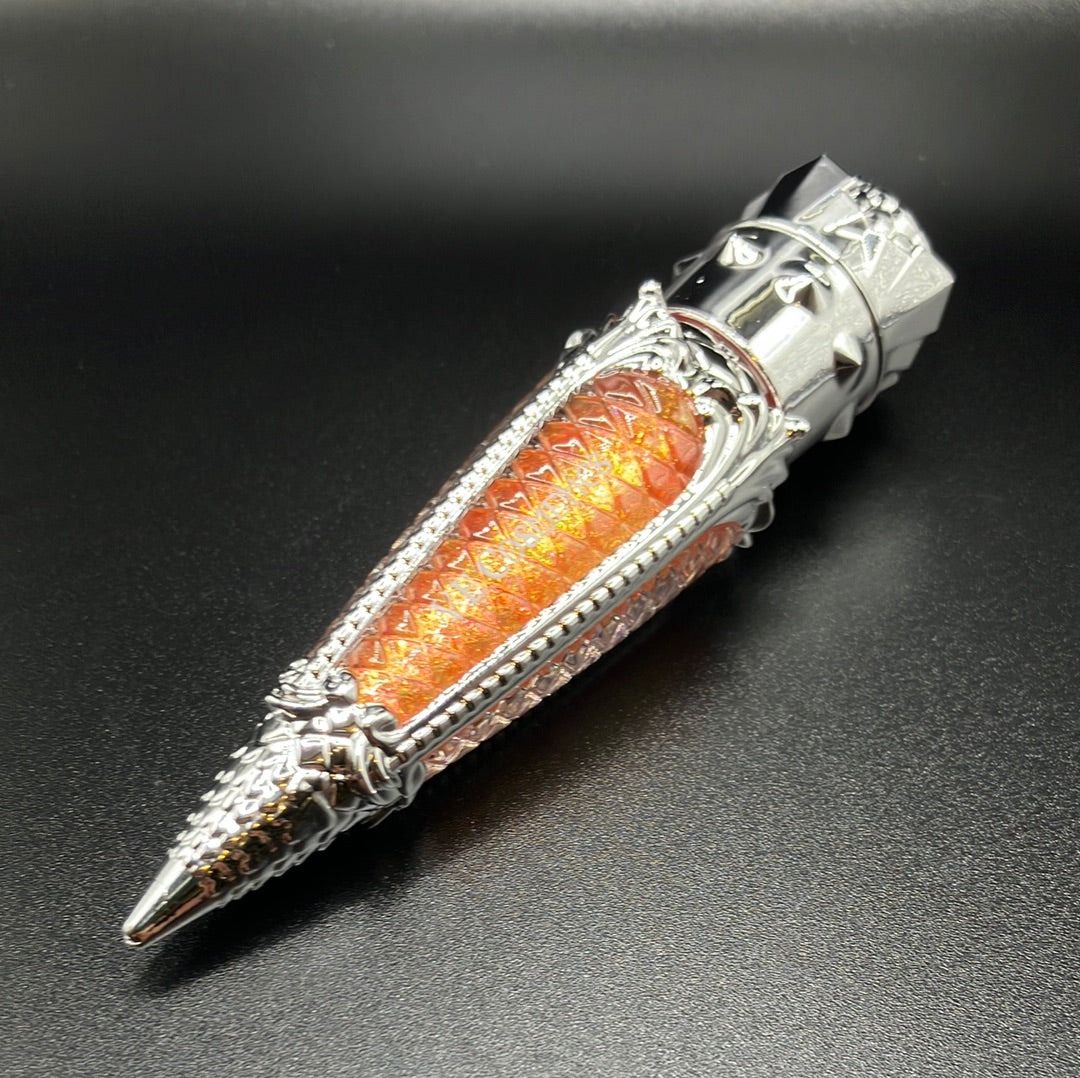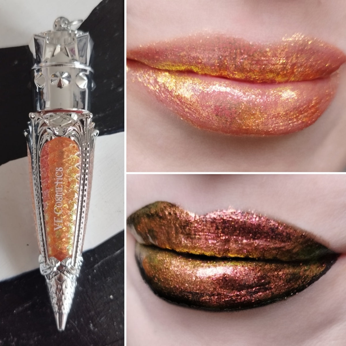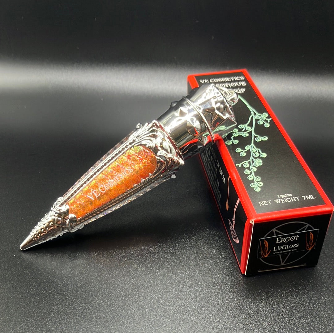 Ergot is a dangerously dazzling multichrome gloss that flickers through orange, pink, gold, green, and peach — a shifting spectrum of surreal shimmer. Inspired by the intoxicating legacy of the ergot fungus, long associated with hallucination, hysteria, and the whispered origins of witch trials, this shade is pure spellwork for the lips.