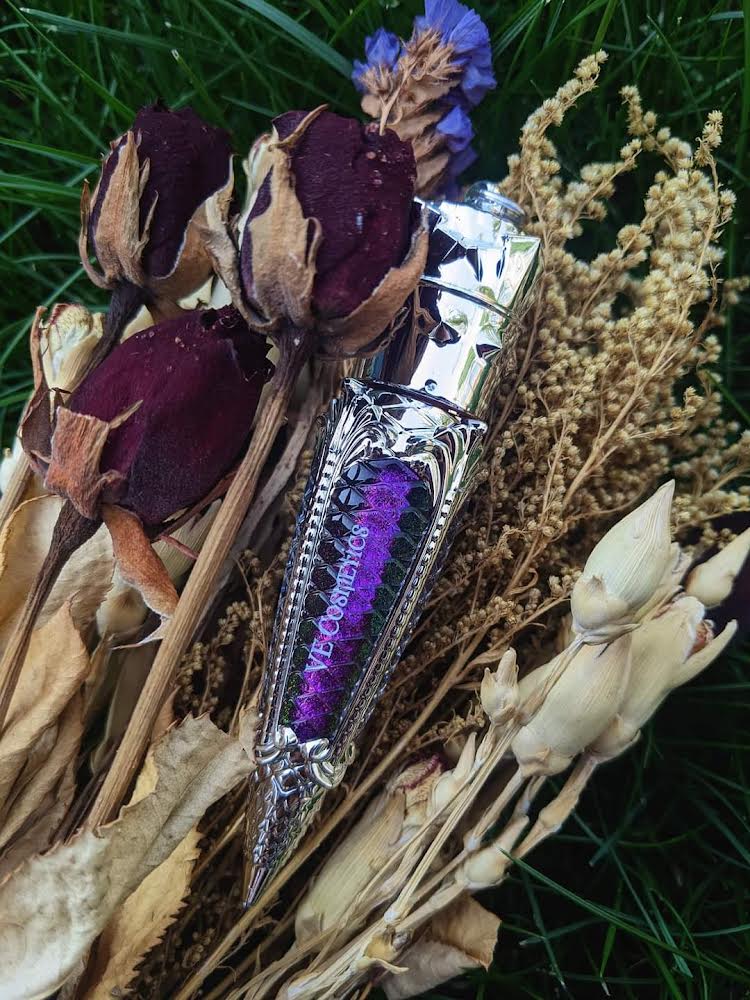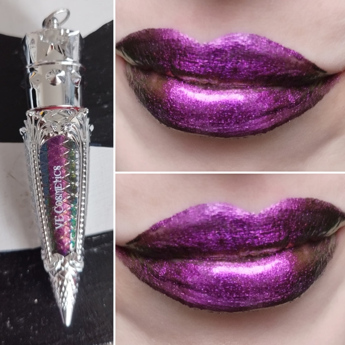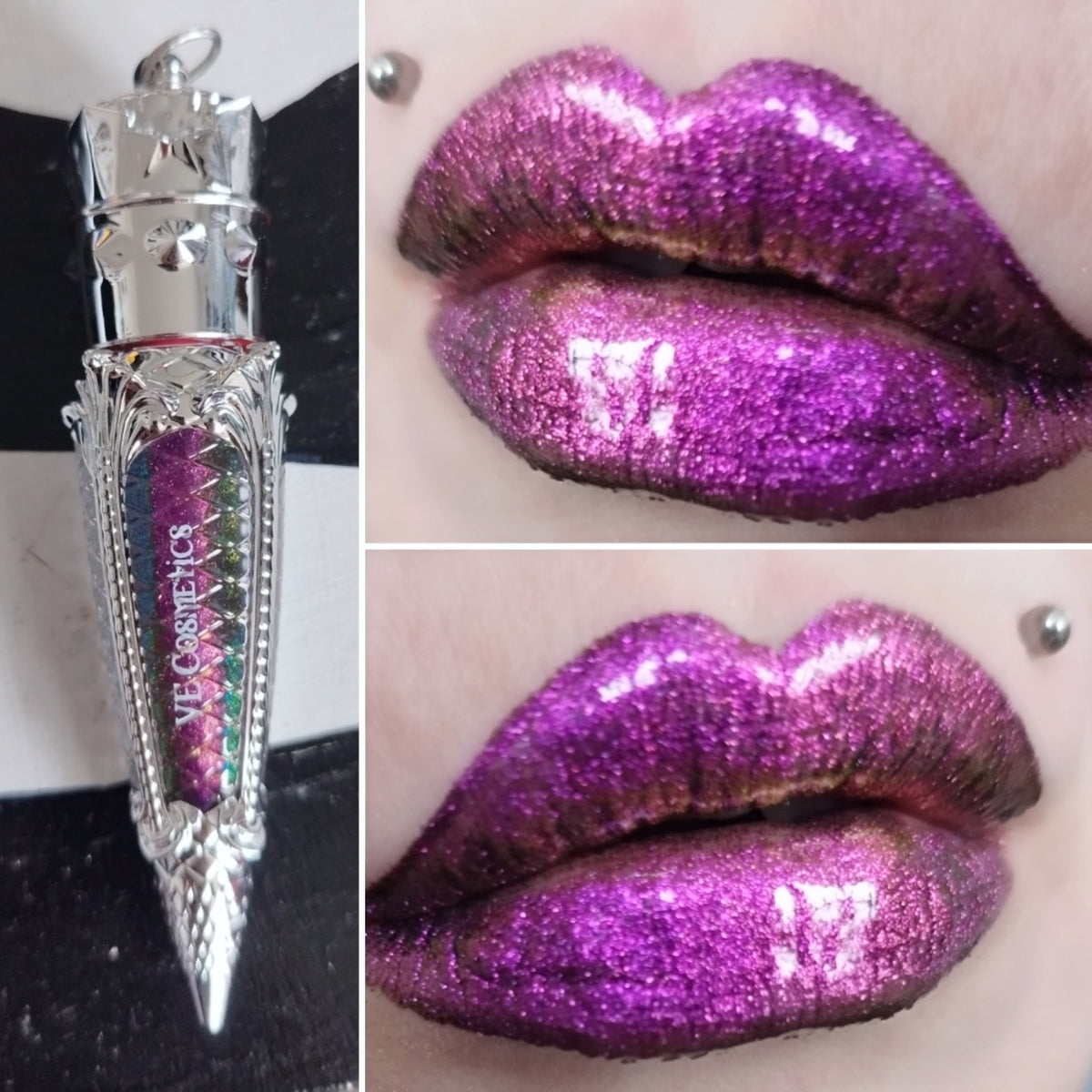 Alone, it offers a vibrant shimmer that glows like moonlight on velvet petals. Layered over black lipstick, it transforms into something far more potent — dark, dimensional, and impossible to ignore.