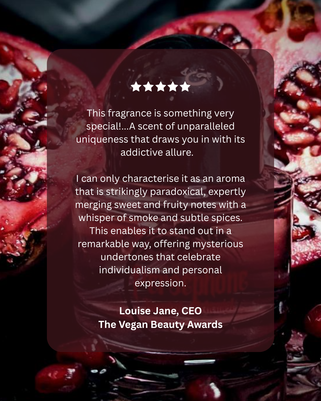 Persephone is formulated to be long-lasting, evolving throughout the day from bright pomegranate to warm patchouli and woody depth.