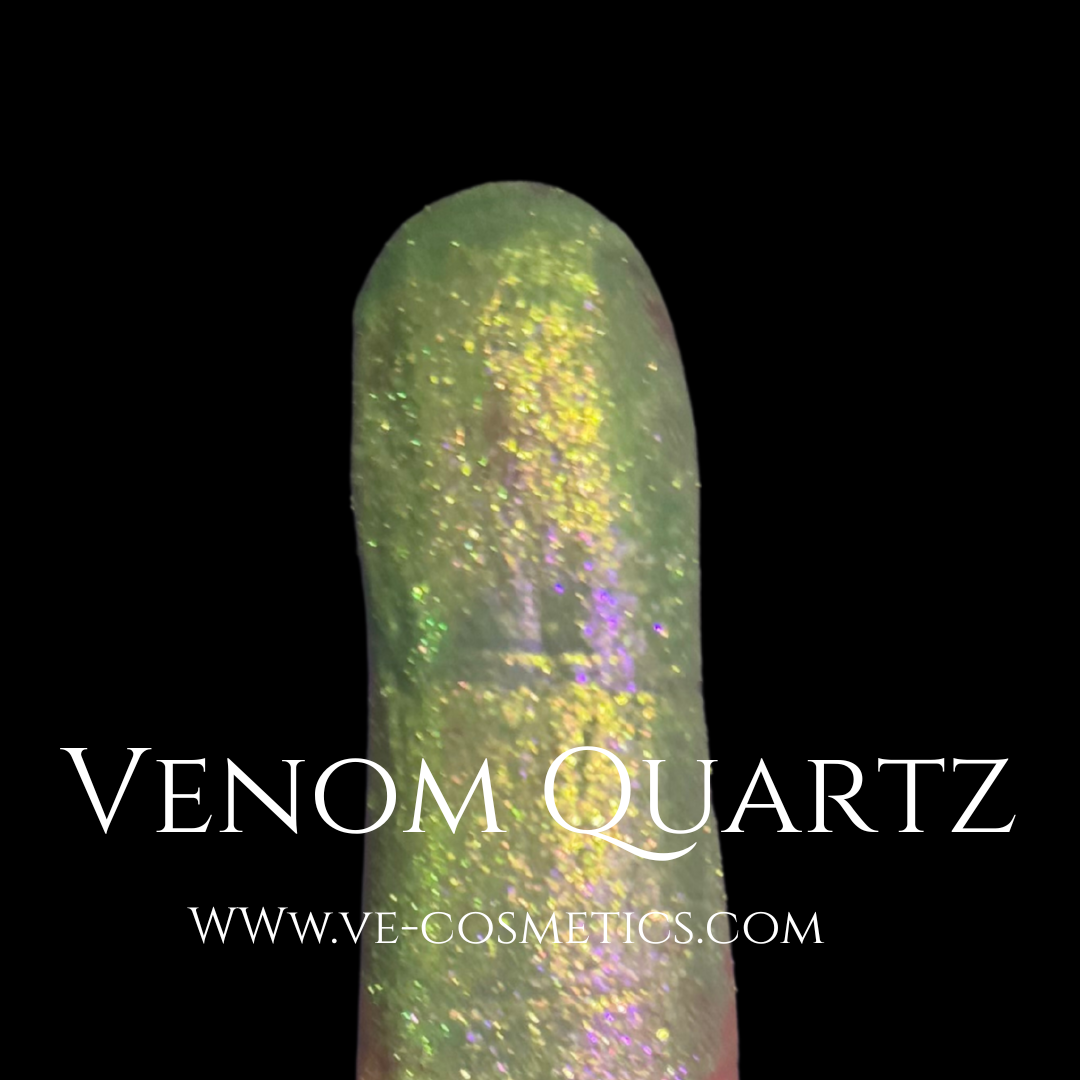 Venom Quartz strikes immediately. The green isn’t muted, it’s sharp, electric, and unapologetic. As it shifts, flashes of antique gold emerge beneath the surface, adding depth without dulling the intensity.