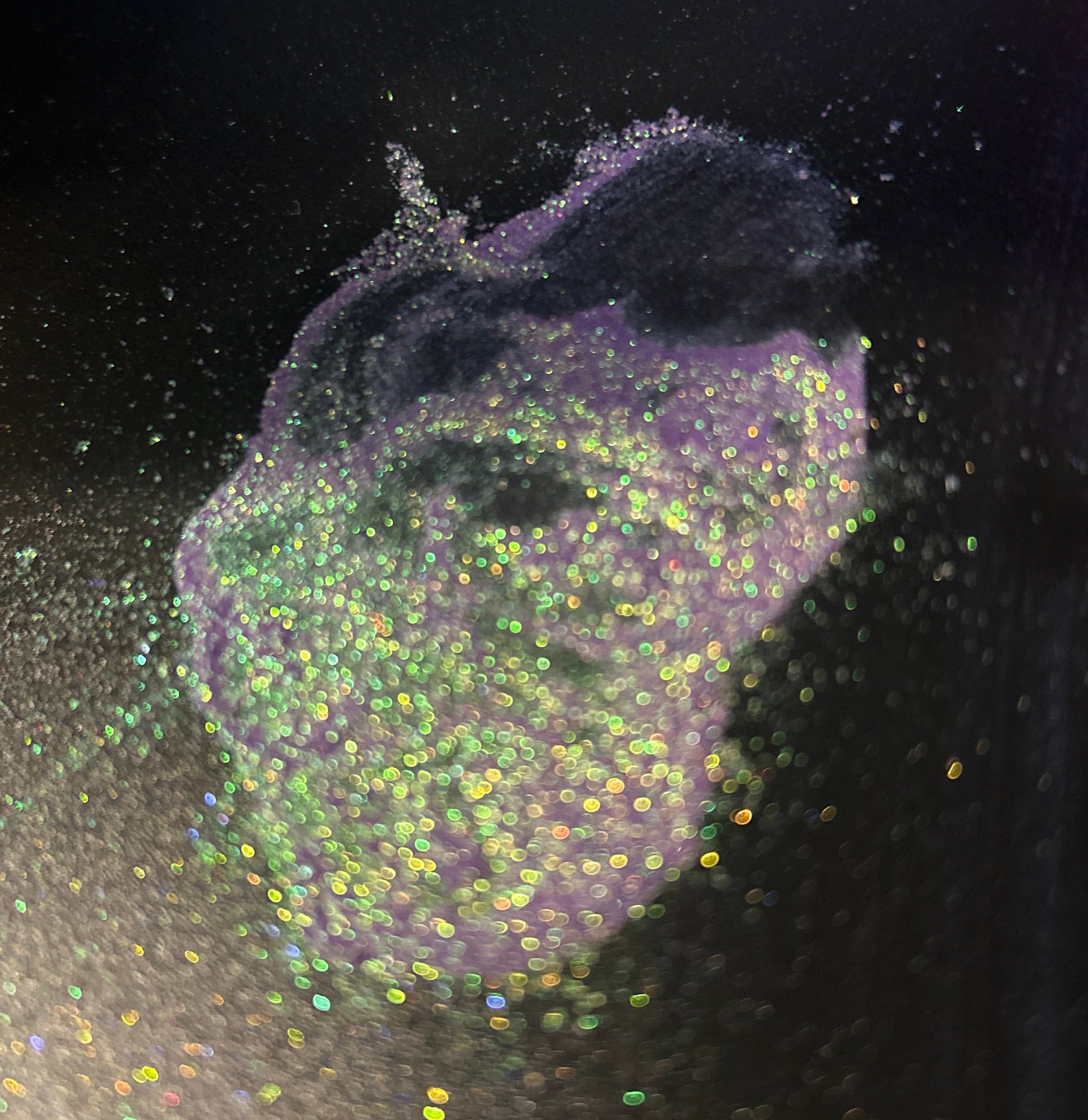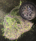 Hexed Iris is not subtle. It shifts sharply between spectral violet and electric green, with flashes of warmth that catch at the edges like a breaking spell. Over black, it deepens into something darker, almost venomous. Over a lighter base, it glows with prismatic intensity.